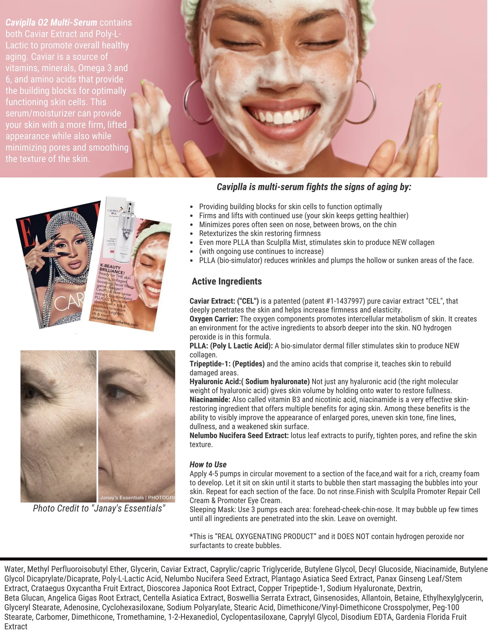 Poly-L-Lactic Acid stimulates the production of collagen in your skin, which can reduce wrinkles and fills in hollow and sunken areas of the face neck, and chest. The Caviplla Caviar Extract + Oxygen Carrier Multi-Serum is formulated with a cutting-edge oxygen delivery system. This oxygenation causes the serum to bubble up on the skin, leading to deeper product penetration.
