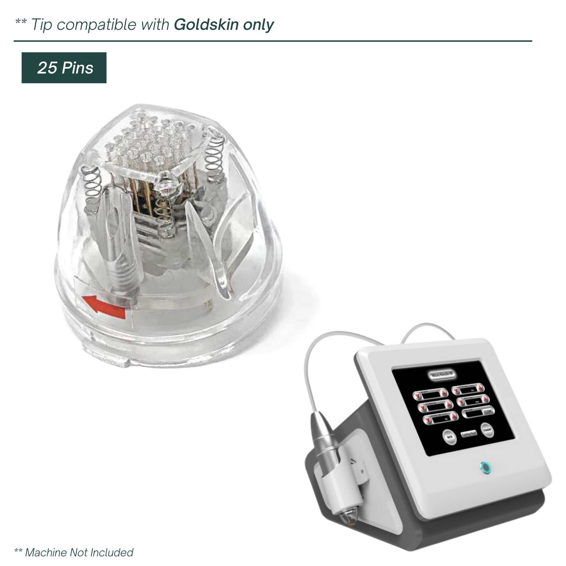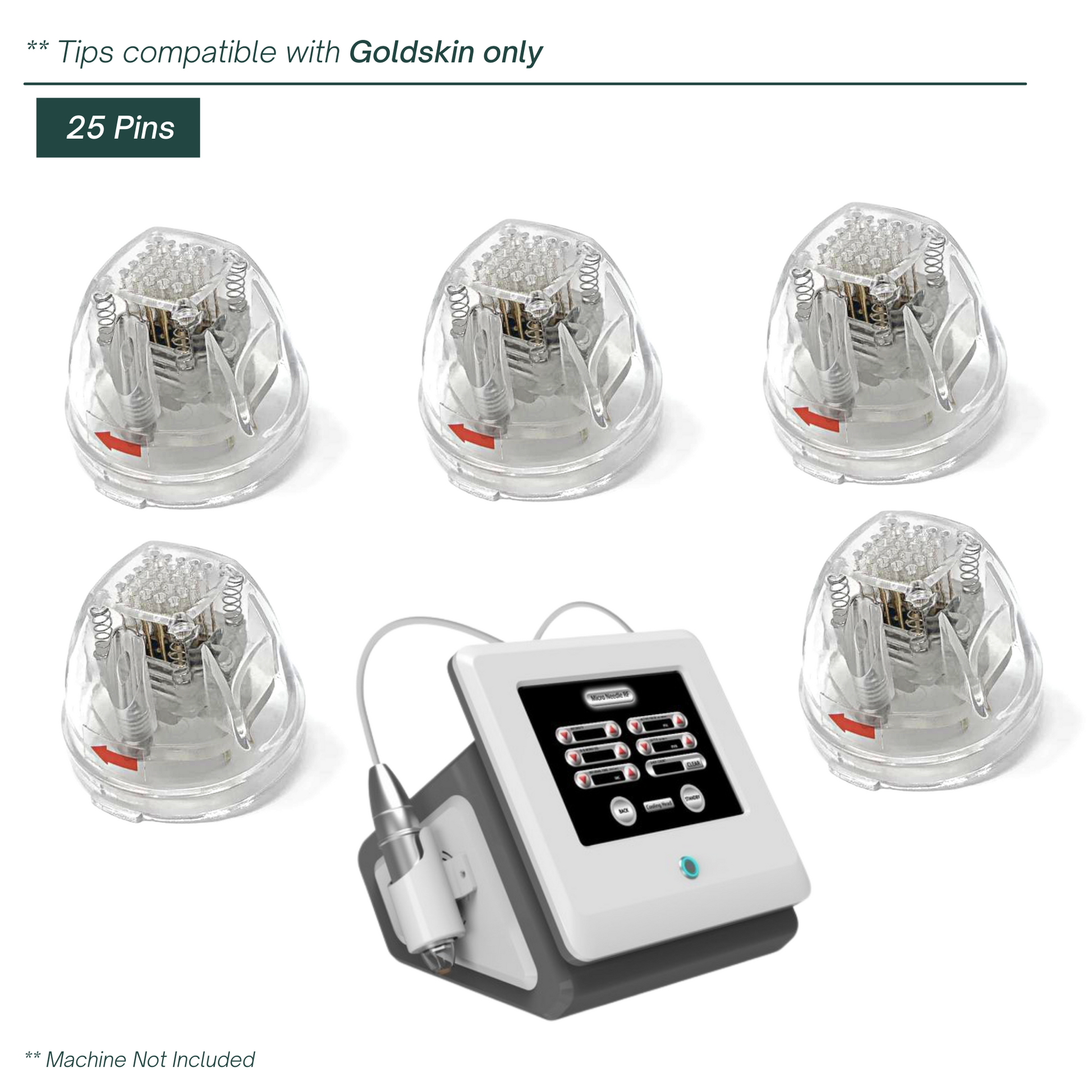 This disposable insulated 25 tip is designed for Microneedling Radiofrequency with the Goldskin. It includes a total of 25 pins that penetrate the dermis and epidermis to induce collagen remodeling and tighten skin, erase signs of aging, and fade scars.