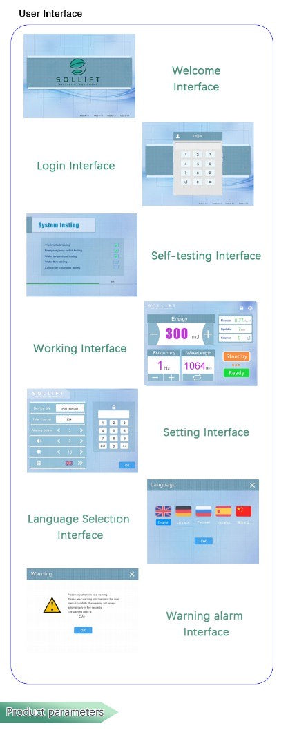 Display Control System: It is all about the easy to navigate touch screen, which displays relevant operative parameters. The laser output energy can be adjusted and all features can be adjusted quickly with the click of a button. Its intelligent system will send acoustic-optic indications in case of any errors.